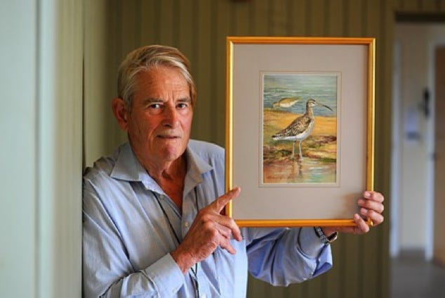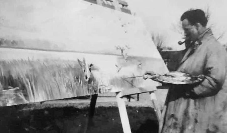 Roland Green seen (left) working on a large frieze that was destined to hang in Whiteslea Lodge (right)and one of his paintings being auctioned in aid of the Wildlife Trust.