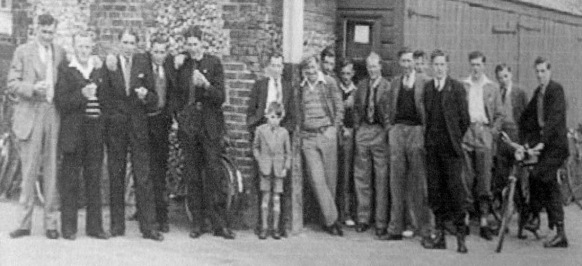 Left to right: Dennis Flaxman, Sambo Beales, Bernard Amis, Doddo Sheppard, Denny(?) Newman, Teddy Goldby, Clicko Goldby, Gilbert Lambert, Herbert Beales (head) Russell Brookes, Bobby Nichols, ???Dennis Alcock, Stanley Cator, Roy Lambert, End:Wilfred Alcock