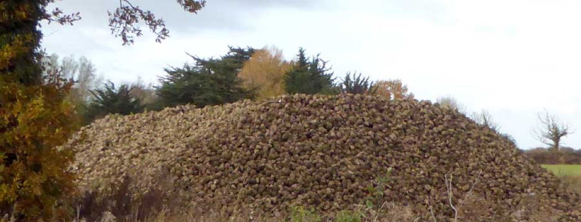 This picture shows a current day pile of sugar beet that has been harvested and is waiting for the big vehicles - lorry, tractor and conveyor belt - to come and load it to go to the factory.