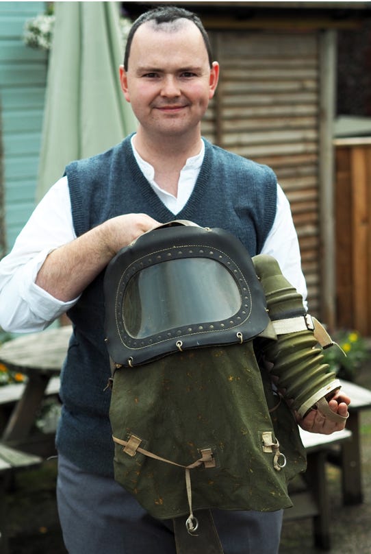 The baby’s gas mask seen here is in the collection of Darren (pictured), owner of Poppylands Tea Rooms in Horsey, Norfolk. Much of his collection of military memorabilia is on show in the Tea Rooms which have an authentic 1940’s ambience.