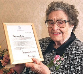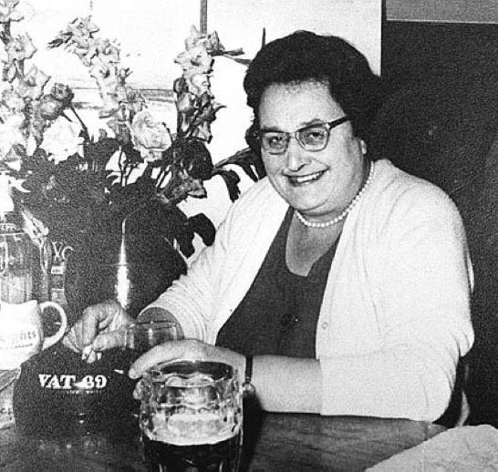 Below a photo of Gwen Amis when she was landlady at The Pleasure Boat, and a photo of her on her 90th birthday with a letter from Prince Charles remembering his stay at the pub.