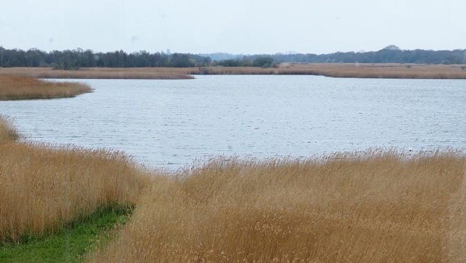 Below: a view from the top of the Mill showing an inlet from the Broad (taken in April 2019).